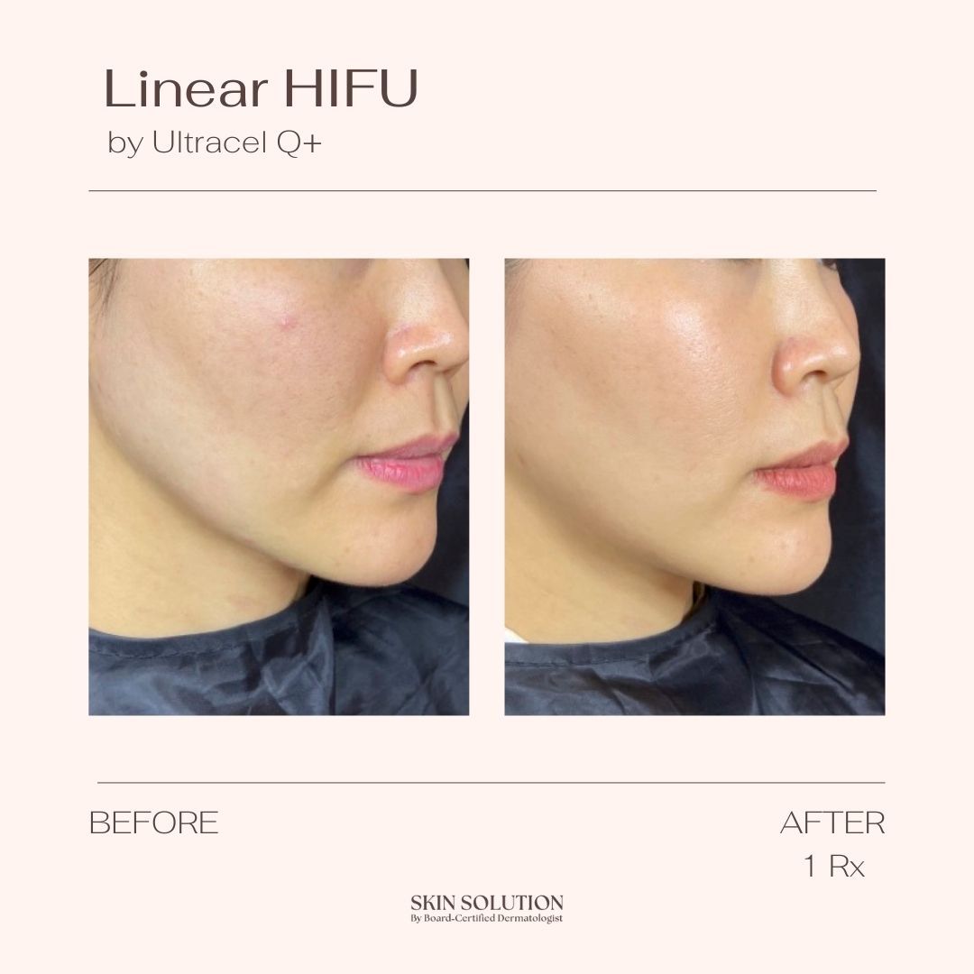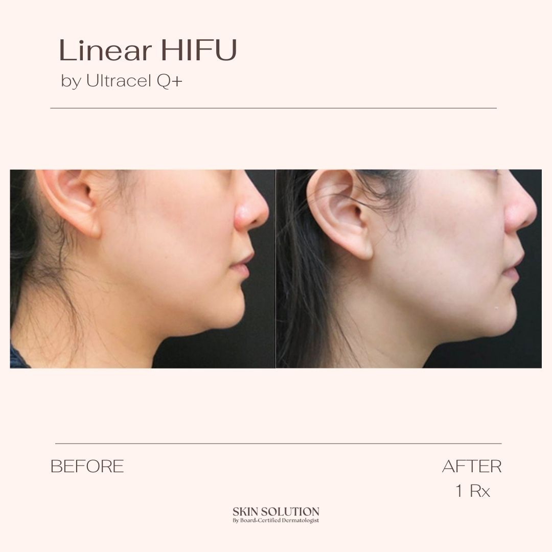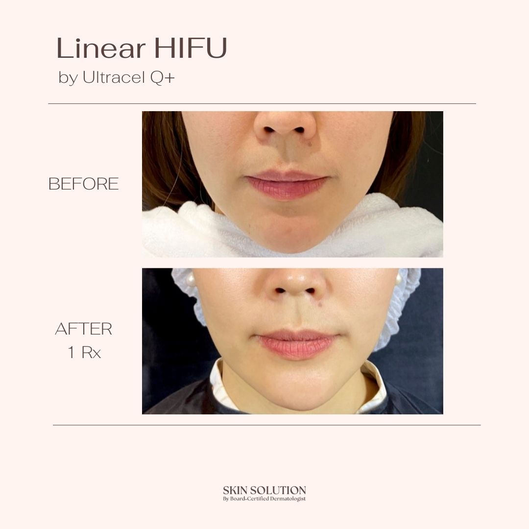 LINEAR HIFU by Ultracel Q+ นวัตกรรมยกกระชับผิวด้วยเทคโนโลยี High Intensity Focused Ultrasound (HIFU) ปล่อยคลื่นพลังงานความถี่สูงทั้งแบบ DOT และ LINEAR ที่ช่วยกระตุ้นการสร้างคอลลาเจนและสลายไขมัน ลงลึกถึงชั้นผิวกับ 6 หัวทิปเพื่อการตอบโจทย์ผิวอย่างครอบคลุม ทำให้ผิวยกกระชับ ผิวเฟิร์ม พร้อมสลายไขมันส่วนเกิน ให้กรอบหน้าชัด ลดเลือนริ้วรอย เห็นผลลัพธ์หลังทำทันที 15-20% โดยไม่ต้องพักฟื้นนาน